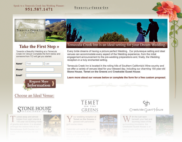 Lead-gen page for Temecula Creek Inn focusing on their wedding packages.JC Golf